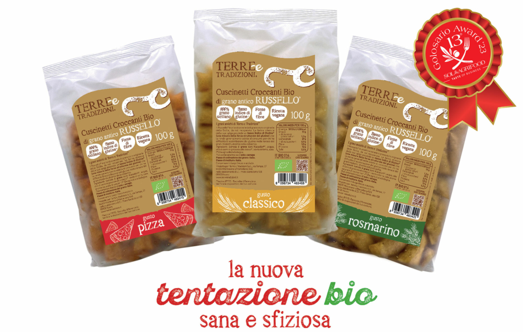 Inoltre siamo orgogliosi di comunicare che i nostri Cuscinetti Croccanti Bio, hanno vinto il premio GOLOSARIO AWARD 2023 come “Prodotto Sostenibile” nell’edizione Vinitaly 2023.